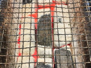 Jetzt ist ein Teil der Kohle am Glühen (die Briketts müssen keinesfalls vollständig durchgeglüht sein, bevor mit dem Grillieren gestartet werden kann).