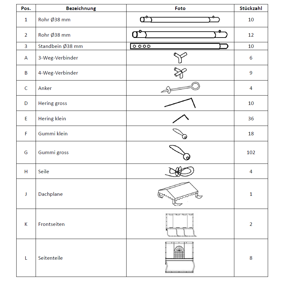 Verbinder etc. gemäss der Teileliste auf der Aufbauanleitung. So können Sie sich schonmal mit dem Materialumfang vertraut machen und vergewissern sich dabei, dass jedes auch noch so kleine Teil vorhanden ist, wenn Sie das Zelt dann aufstellen wollen.