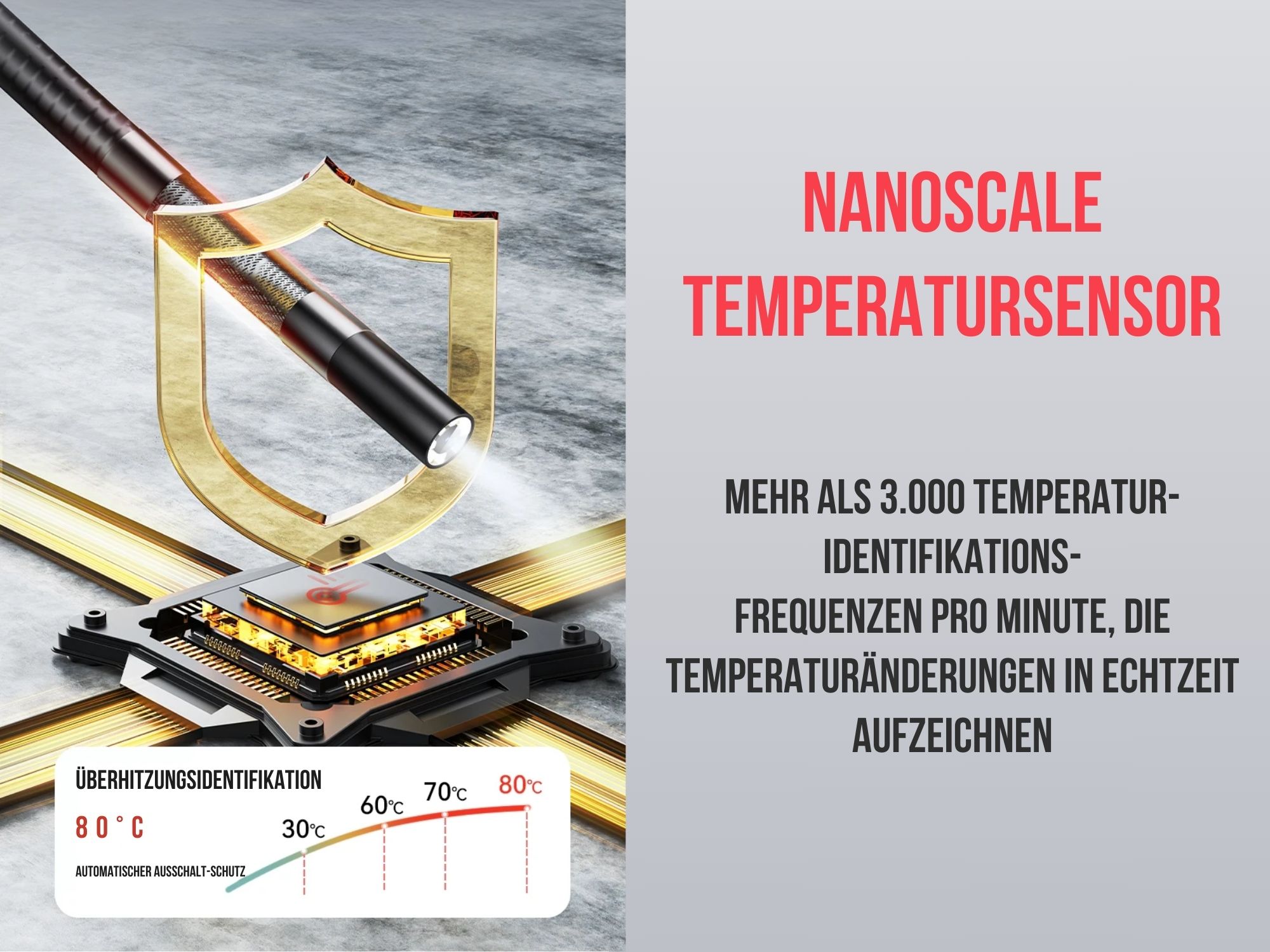 • Automatisches Abschlaten als Überhitzungsschutz, bei Temperatur > 80°C