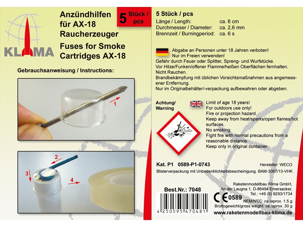 Um die Rauchpatronen problemlos auch bei stärkerem Wind oder laufendem Propeller anzünden zu können, wurde die Möglichkeit geschaffen, diese auch mit Zündschnur anzuzünden. Diese Zündschnüre werden einfach mit den dazugehörenden Kunststoffkappen auf die Patrone geschoben und am herausragenden Ende entzündet. Die Entzündung der Zündschnur kann auch mit einem Glühdraht erfolgen. Die Lieferung erfolgt in einer Fünfer-Packung zusammen mit den Kappen für AX-18 oder AX-9 Patronen.