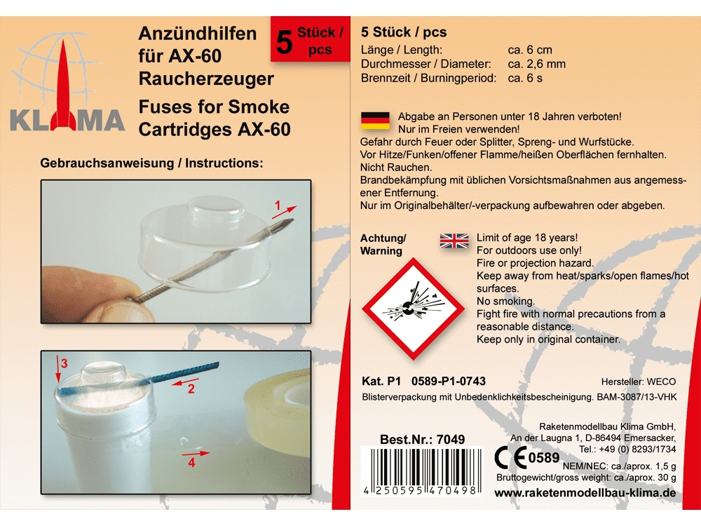 Um die Rauchpatronen problemlos auch bei stärkerem Wind oder laufendem Propeller anzünden zu können, wurde die Möglichkeit geschaffen, diese auch mit Zündschnur anzuzünden. Diese Zündschnüre werden einfach mit den dazugehörenden Kunststoffkappen auf die Patrone geschoben und am herausragenden Ende entzündet. Die Entzündung der Zündschnur kann auch mit einem Glühdraht erfolgen. Die Lieferung erfolgt in einer Fünfer-Packung zusammen mit den Kappen für AX-60 Patronen.