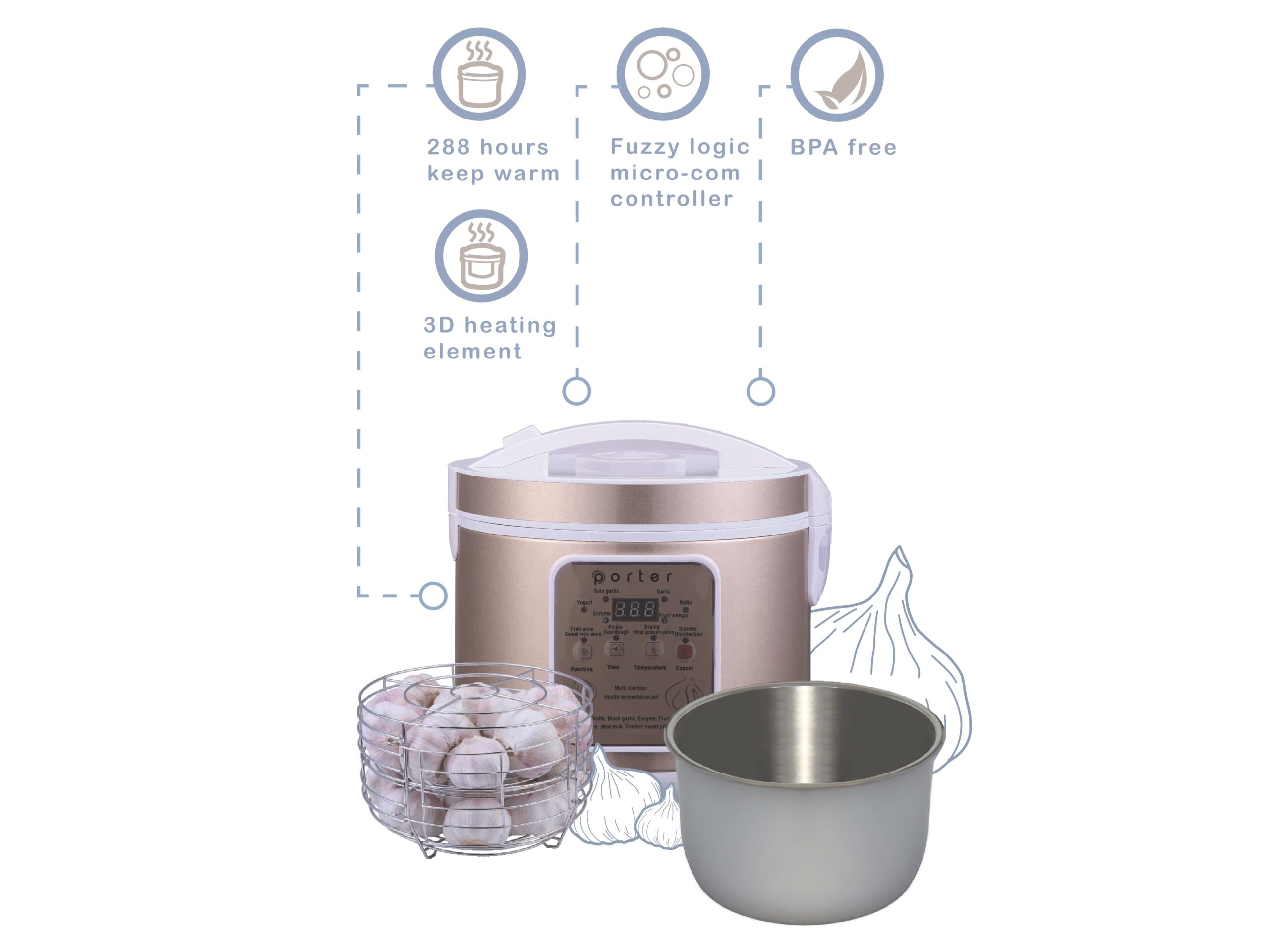 Neben der Fermentation von Knoblauch können Sie mit dem Fermenter auch Joghurt, Fruchtessig, Natto, Kimchi, Eintöpfe oder Schongar-Gerichte herstellen.