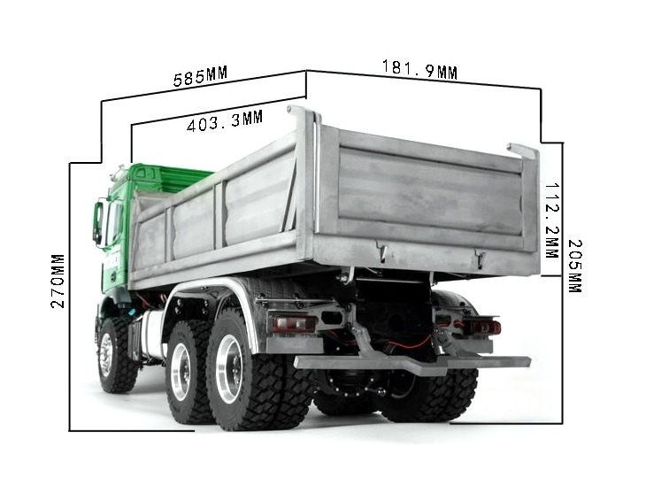 Sehr detailiertes Modell eines 6×6 LKW Fahrgestells mit hydraulischer Kippmulde.Das Fahrgestell ist für den Aufbau des Tamiya MB Arocs Fahrerhauses vorbereitet.