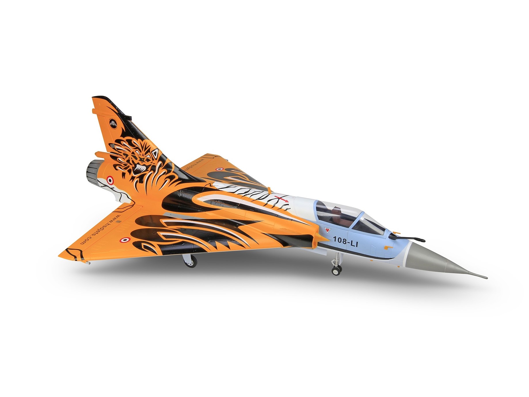 TURBO Mirage-2000 – in der PNP Version, vorbereitet für den Einbau einer 6kg Turbine. Das Modell ist weitgehend vorgefertigt und innert kurzer Zeit bereits flugfertig. Die Mirage verfügt über ein gefedertes, elektrisches Aluminium-Einziehfahrwerk mit elektrischer Bremse. Alle Komponenten wie das gefederte Fahrwerk, Tanks, Schubrohr, Digital-Servos, Smokepumpe, u.s.w, sind bereits eingebaut.