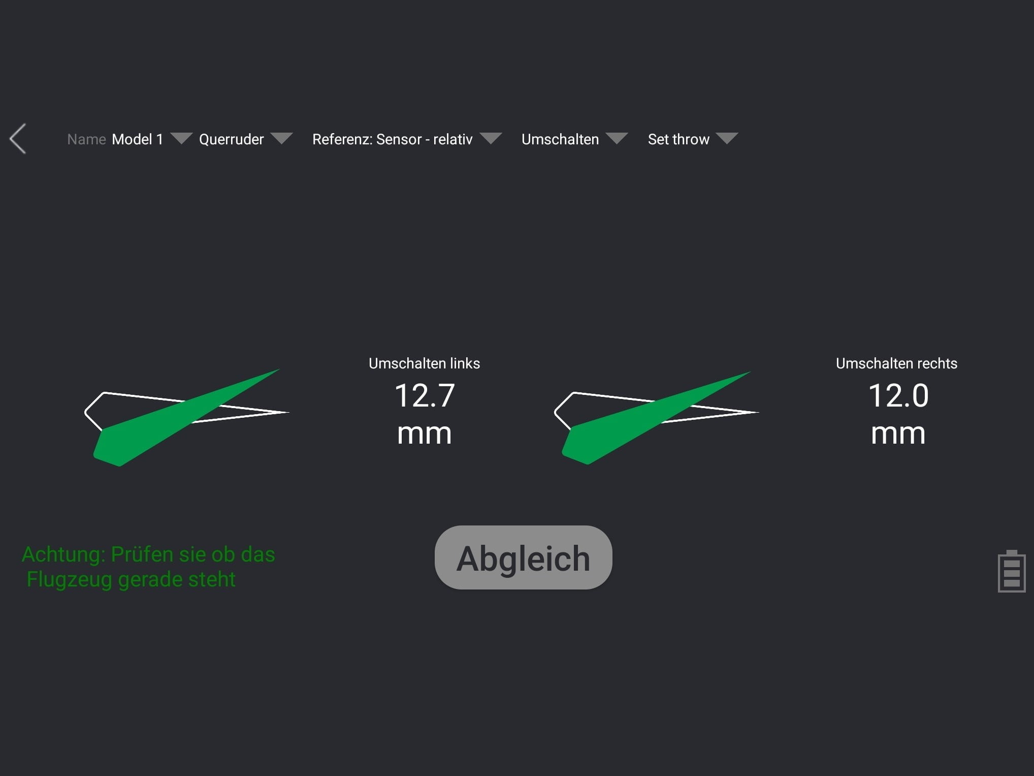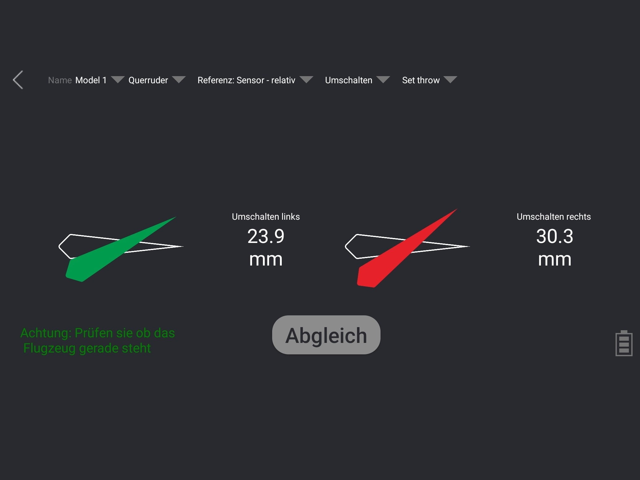 Der Ruderausschlag kann in Grad oder Milimetern gemessen werden.