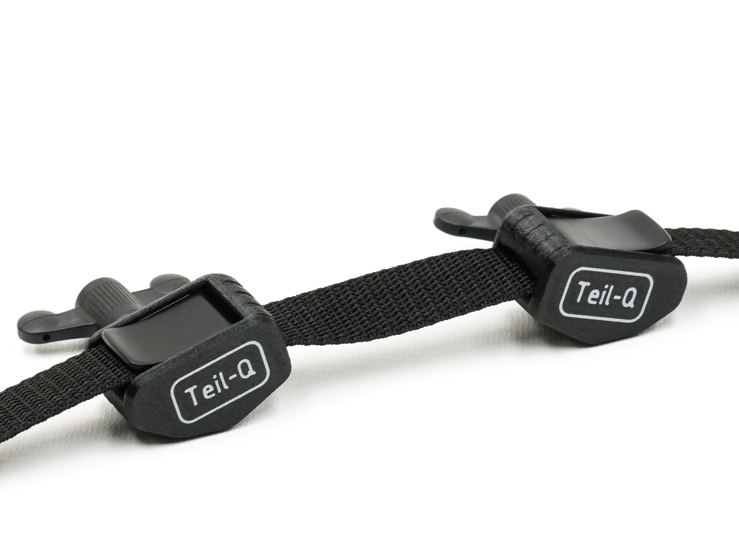 Das Gurtband wird beidseitig durch eine Hebelklemmschnalle gehalten. Dadurch lässt sich das Band ohne Werkzeug in der Länge verändern oder komplett entnehmen. Die Halter werden mit einer M6 Flügelmutter am Teil-Q Modellständer befestigt. Dazu kann eine freie Bohrung oder eine Nut vom Modellständer genutzt werden. Die Halter bestehen aus PETG-Kunststoffteilen, die an den mechanisch relevanten Stellen verstärkt sind. Die Hebelklemmschnalle selbst besteht aus Polyacetal, um eine sichere Funktion auf Dauer zu gewährleisten.